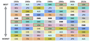 Ranking giełd poszczególnych krajów wg dekad, 1950-2019