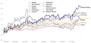 Od dołka bessy w marcu najsilniejsze nie są wcale spółki technologiczne, ale spółki surowcowe (na wykresie poniżej oznaczone jako „metals and mining”). Zgodnie z tezami z prezentacji „Dekada inflacji” uważamy, że ten sektor będzie należał do najlepszych segmentów rynku akcji w najbliższych latach.