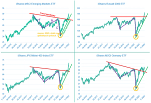 - dołek w marcu 2020 roku, trend wzrostowy od tego momentu wraz z przebiciem w ostatnich tygodniach dwuletniego trendu spadkowego.