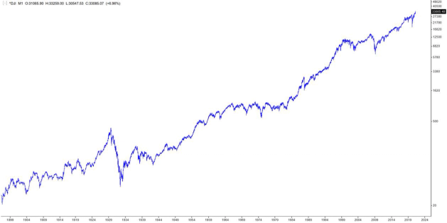Można na poniższy wykres najważniejszego rynku świata obejmujący ponad 120 lat popatrzeć jak na linię pokazującą trend wzrostowy kursów akcji. Ale można też popatrzeć jak na dowód nieustającej ludzkiej kreatywności i zaradności.