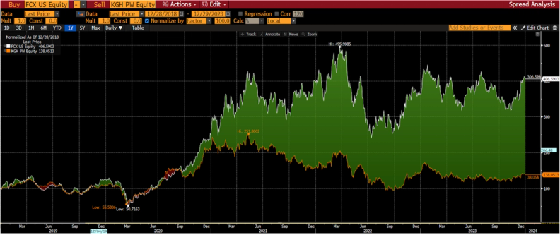 Na przykład w amerykańską spółkę Freeport-McMoRan, na którą prędzej czy później natknie się każdy analityk zajmujący się polskim KGHM, czy w ogóle spółkami miedziowymi. Na wykresie z lat 2019–2023 widać, że przy stopie zwrotu (w lokalnej walucie) z akcji KGHM na poziomie 38% osiągnęlibyśmy na amerykańskiej spółce zysk przekraczający 300%(!). To ogromna dysproporcja i oczywiście mocny argument skłaniający do poszukiwania branżowych liderów również poza granicami Polski.
