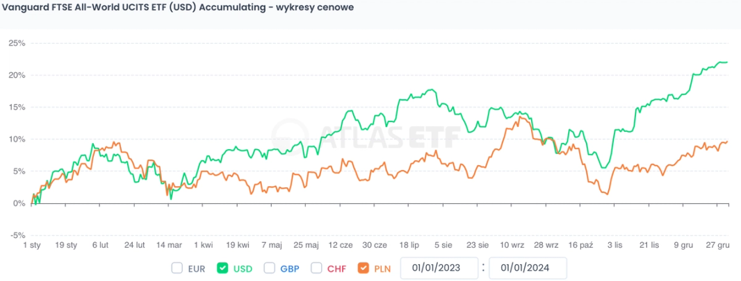 W minionym roku głównym "winowajcą" dużego rozjazdu ETF względem jego wyniku w Stanach (+10,0% vs +22,3%) okazała się waluta - punkt (3) powyższej listy. Ponad ½ wyniku rocznego ETFa zjadły różnice kursowe. Poniżej porównanie wyniku ETF w tych dwóch walutach z serwisu AtlasETF.pl: