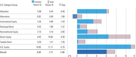 Analizą takich „luk behawioralnych”, niezależnie od tego z czego wynikają (dyskrecjonalne decyzje inwestującego, czy też po prostu regularność wpłat i wypłat) zajmuje się firma analityczna Morningstar. W ich corocznym raporcie Mind the Gap, podają szacunek luki behawioralnej dla różnych typów funduszy inwestycyjnych (także pasywnych) w perspektywie 10-letniej. Raport dostępny jest dla każdego po bezpłatnym zarejestrowaniu (tutaj), a slajd z tegorocznego badania wygląda tak: