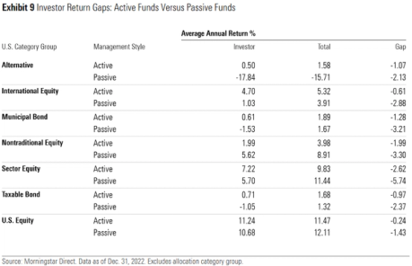 Co ciekawe, autorzy zauważają, że luka jest tu większa dla funduszy pasywnie zarządzanych. Różnica jest na tyle istotna, że w części strategii realne wyniki inwestorów były lepsze w strategiach aktywnie zarządzanych, nawet pomimo tego że teoretyczne stopy zwrotu były tu gorsze od pasywnych. Wynikało to z o wiele mniejszej luki w strategiach aktywnych.