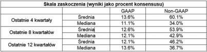 Okazało się, że na przestrzeni ostatnich 12 kwartałów (3 lat) spośród wszystkich wyników analizowanych spółek, które były odmienne od konsensusu, 22% z zaskoczeń GAAP było negatywnych, gdzie tylko 6% zaskoczeń non-GAAP było negatywnych. To znaczy, że wyniki GAAP zaskakiwały negatywnie aż ponad 3.5 razy częściej niż wyniki non-GAAP. Prawidłowość ta utrzymuje się w pozostałych okresach, gdzie w ostatnich 4 kwartałach, stosunek negatywnych zaskoczeń GAAP vs non-GAAP sięga aż ponad 8x.