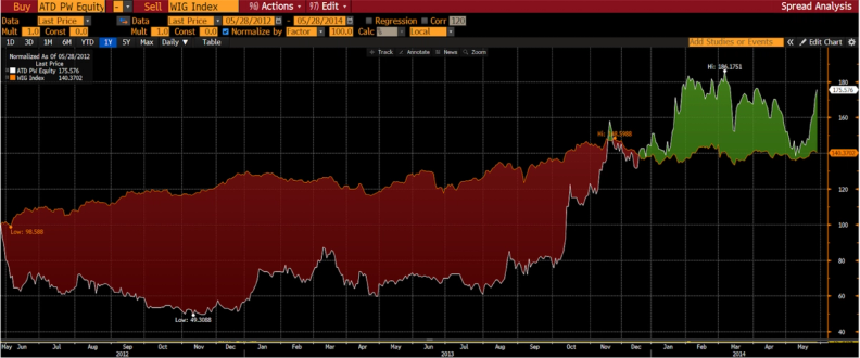 Poniższy wykres demonstruje zachowanie kursu akcji ATM SI (spółka w pewnym momencie zmieniła nazwę na Atende) na tle indeksu WIG przez pierwsze dwa lata obecności podmiotu na giełdzie. Dobrze zobrazowana jest wielomiesięczna dekoniunktura na akcjach spółki i późniejsze, gwałtowne wzrosty kursu, kiedy rynek zaczął odzwierciedlać realną wartość biznesu. Wskutek tego stopa zwrotu z akcji po dwóch latach była prawie dwukrotnie wyższa niż dla WIG, który w tym okresie wzrósł przecież o bardzo solidne 40%.