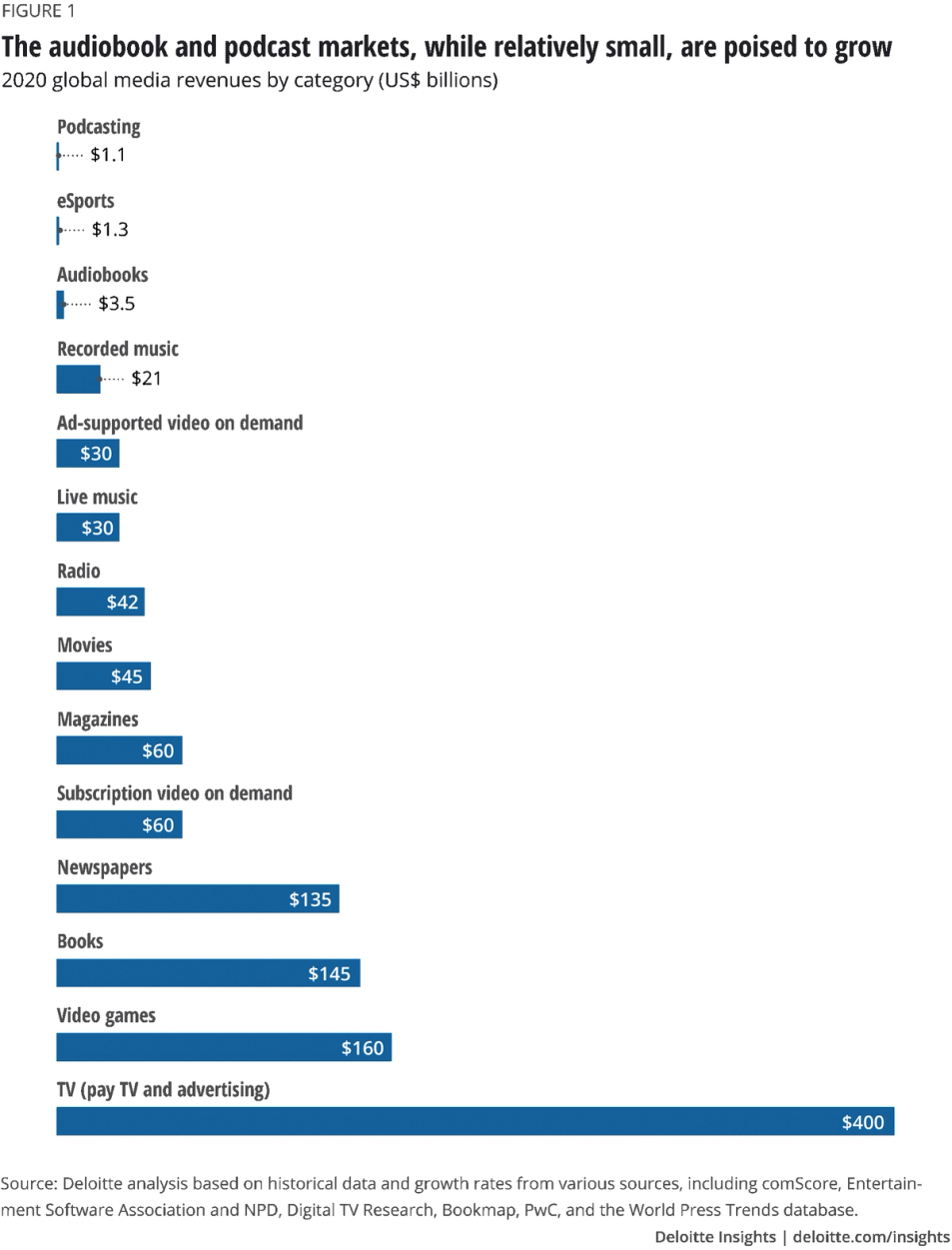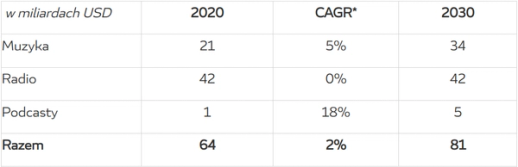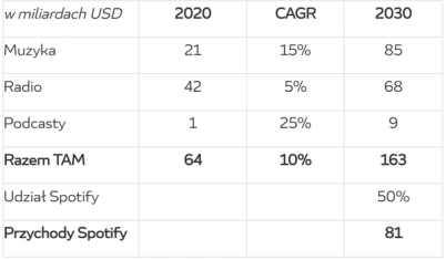 Spotify działa przede wszystkim na rynku sprzedawania nagranej muzyki, czyli bezpośrednio konkuruje z muzyką sprzedawaną na płytach CD, ale też z innymi formami elektronicznej dystrybucji muzyki – globalnie rynek ten jest wart 21 miliardów USD rocznie. Rynek po okresie stagnacji w latach 2000-2015 powrócił do wzrostów za pomocą serwisów jak Spotify i obecnie rośnie w tempie ok. 10% rocznie, ze względu na wciąż relatywnie małą penetrację streamingiem. Zakładając 5% średnią roczną dynamikę wzrostu, to w perspektywie 10 lat rynek ten mógłby osiągnąć wielkość 34 miliardów USD, czyli aż 62% więcej niż obecnie oraz 36% więcej niż w rekordowym dla branży roku 1999. Serwis Spotify pośrednio konkuruje też z rynkiem rozgłośni radiowych, generujących globalne przychody o wartości 42 miliardów USD. Rynek radiowy, choć relatywnie odporny na zmiany w porównaniu do innych tradycyjnych mediów, charakteryzuje się brakiem wzrostu. Ponadto należałoby się spodziewać, że istotny wzrost podcastów będzie odbywał się kosztem rynku radia, zatem samo założenie o braku spadku wartości tego rynku z poziomu 42 miliardów USD w perspektywie 10-letniej można uznać za optymistyczne. Niedawno Spotify postanowił też wejść na mały, ale szybko rosnący rynek podcastów. Podcasty są bardzo podobne do audycji radiowych, z tą różnicą, że są wcześniej nagrane i potem udostępniane w Internecie, w przeciwieństwie do audycji zazwyczaj odbywających się na żywo w tradycyjnym radiu. Rynek podcastów szacowany jest obecnie na nieco ponad 1 miliard USD. Deloitte szacuje, że wielkość tego rynku może wzrosnąć aż do 3.3 miliarda USD do 2025 roku. Zakładając odrobinę niższe dynamiki wzrostu w kolejnych latach (2025-2030), możemy przyjąć, że podcasty wygenerują łącznie 5 miliardów USD w 2030 roku.