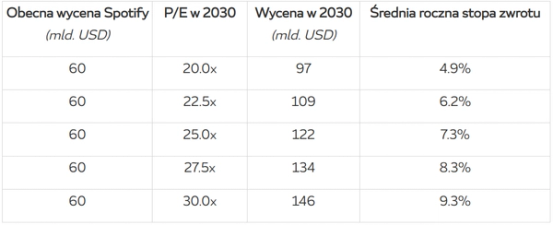 Jak należy wycenić taki zysk? Dobrą spółką do porównania jest amerykański Comcast – jest to duży koncern medialny z silną pozycją na rynku, ale relatywnie powolnym wzrostem przychodów. Tego spodziewamy się od Spotify, bo skoro zdobędzie już prawie cały rynek, to trudno będzie mu dalej rosnąć, o ile nie postanowi wejść w zupełnie nowy rodzaj działalności.