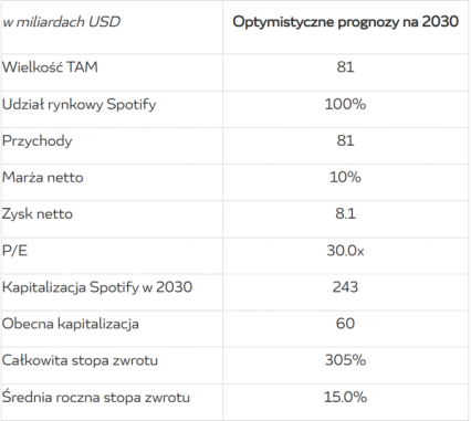 Przyjmując optymistyczną perspektywę, możemy założyć, że Spotify zawojuje prawie cały rynek, jaki ma do zaadresowania. Jednak zachowując pewną dozę realizmu, powinniśmy uwzględnić to, że zawsze będzie istniała konkurencja, a także to, że pewne rynki (m.in. wszystkie kraje autorytarne) są dla Spotify praktycznie niedostępne (np. Chiny, gdzie znajduje się niecałe 20% populacji Ziemi). Przyjmijmy, że Spotify w 10 lat zdobędzie ¾ rynku, jaki będzie miał do zaadresowania. Daje to wartość 60.75 miliarda USD. Obecne przychody Spotify to ok. 9.5 miliarda USD rocznie. Dla porównania, obecne roczne przychody Netfliksa to 25 miliardów USD.
