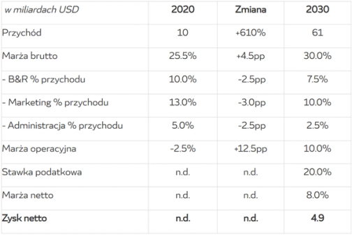 W 2020 roku Spotify miał marżę brutto na poziomie 25%. Jest to dość niska marża, która wynika z tego, że Spotify musi dzielić się swoimi przychodami z reklam i opłat subskrypcyjnych z właścicielami praw do utworów muzycznych, w związku z czym na marży brutto nie jest odczuwalny efekt skali. Dla porównania, inaczej wygląda sytuacja Netfliksa, który jest w stanie ponieść duże, ale jednorazowe koszty na wyprodukowanie własnych treści, dzięki czemu wraz ze wzrostem liczby subskrybentów koszt produkcji na subskrybenta będzie spadał, a sam model biznesowy się skaluje. W dwóch poprzednich latach (2019, 2018), marża brutto Spotify była na podobnym poziomie jak w 2020 roku (25%), załóżmy jednak, że wraz ze wzrostem skali, podnoszeniem cen i lepszą pozycja negocjacyjną Spotify będzie w stanie zwiększyć swoją marżę brutto aż o 5 punktów procentowych, do 30%. Spotify wydaje ok. 10% przychodów na badania i rozwój, co jest wystarczającym, ale umiarkowanym wydatkiem jak na firmę opierającą swoją działalność o technologię. Załóżmy jednak, że wraz ze wzrostem skali udział tych wydatków spadnie do 7.5% przychodów. Do tego 13% przychodów jest przeznaczonych na marketing (12% w 2019) - tutaj można założyć pewne umiarkowanie i efekt skali, na przykład docelowo 10% przychodów. Ostatnim kluczowym wydatkiem są ogólne koszty administracyjne w wysokości ok 5% sprzedaży w 2020 roku. Tutaj z pewnością jest pole do poprawy efektywności wraz ze wzrostem skali – przyjmijmy wielkość 2.5% przychodów. Przy wyżej szacowanych przychodach (60.75 miliarda USD) i wyżej obliczonym poziomie marży (8% netto) otrzymujemy 4.85 miliarda USD zysku netto w roku 2030. W 2020 miały miejsce koszty finansowe, co do których nie ma pewności, że będą miały miejsce także w 2030, więc pomijamy je w tej analizie. Dodatkowo, przez ujemną marżę przed opodatkowaniem w 2020 roku, zakładamy brak istotności stawki podatkowej w obecnym okresie.