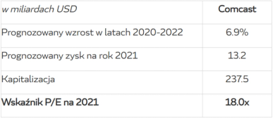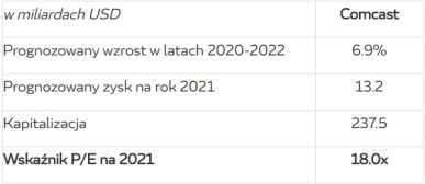 Comcast wyceniony jest na około 18x zysk netto prognozowany na przyszły rok. Zaokrąglijmy tę wartość do pełnego 20x. Na 20-krotność zysku można spojrzeć też w ten sposób: jeżeli dla uproszczenia założymy, że spółka będzie wypłacać każdego roku 100% zysku netto jako dywidendę, to przy takiej wycenie (20-krotność zysku) będziemy otrzymywać stopę dywidendy w wielkości 5% rocznie (czyli odwrotność mnożnika, 1/20 = 5%), co z kolei oznacza 4 punkty procentowe premii nad rentownością obligacji skarbowych USA (10-latki płacą dokładnie 1.125%), co jest solidną premią za ryzyko.